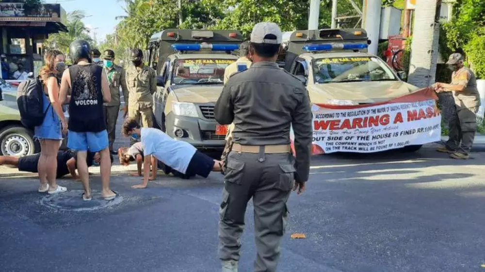 Индонезияның Бали аралында полицейлер COVID-19 таралмауы үшін бекітілген ережелерді сақтамаған туристерді жазалау жағдайлары анықталды. Құқық қорғау органдары өкілдері ережебұзушыларға физикалық жаттығу жасауды мәжбүрлеген. Осындай бір оқиғаның видеосын ABC News жариялады.