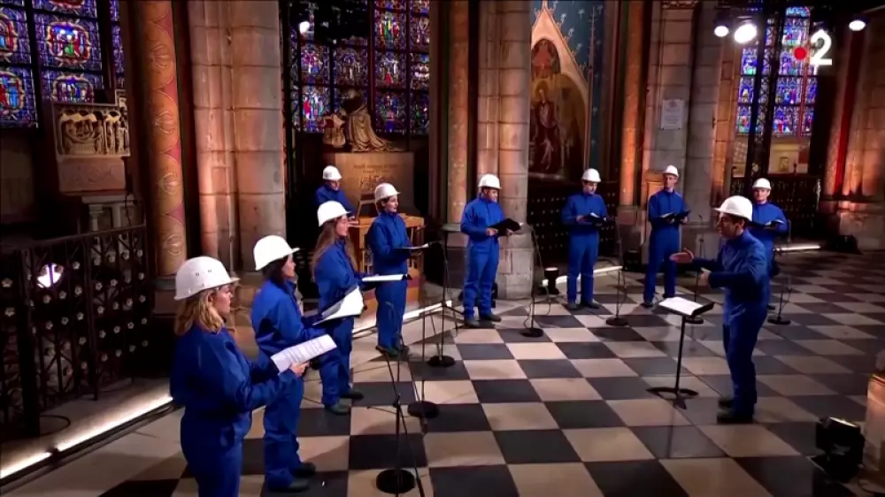 Концертте 20 әнші, 2 солист пен органшы өнер көрсетті. Олар соборда әлі де жөндеу жұмыстары жүріп жатқандықтан құрылыс каскалары мен комбенизон киіп шықты. Шіркеу музыканттарының концерті теледидар арқылы трансляцияланды.