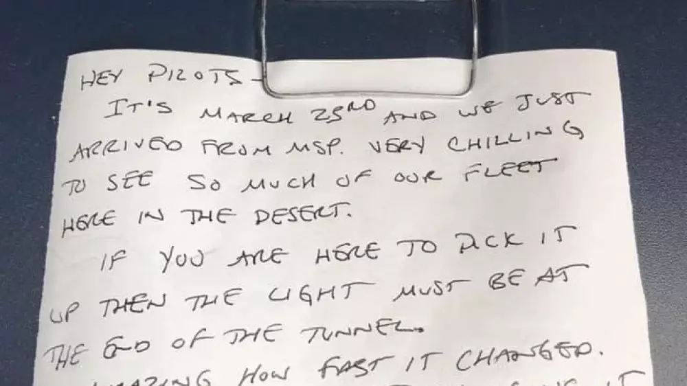 Delta Airlines әуекомпаниясының қызметкері Крис Деннис (Chris Dennis) 2020 жылдың 23 наурызында Калифорния шөліндегі Викторвилл әуежайында тұрған ұшақ салонында нота қалдырды. Ол кезде кейбір рейс коронавирусқа байланысты тоқтатылды, сондықтан кейбір лайнер тұраққа жіберілді.