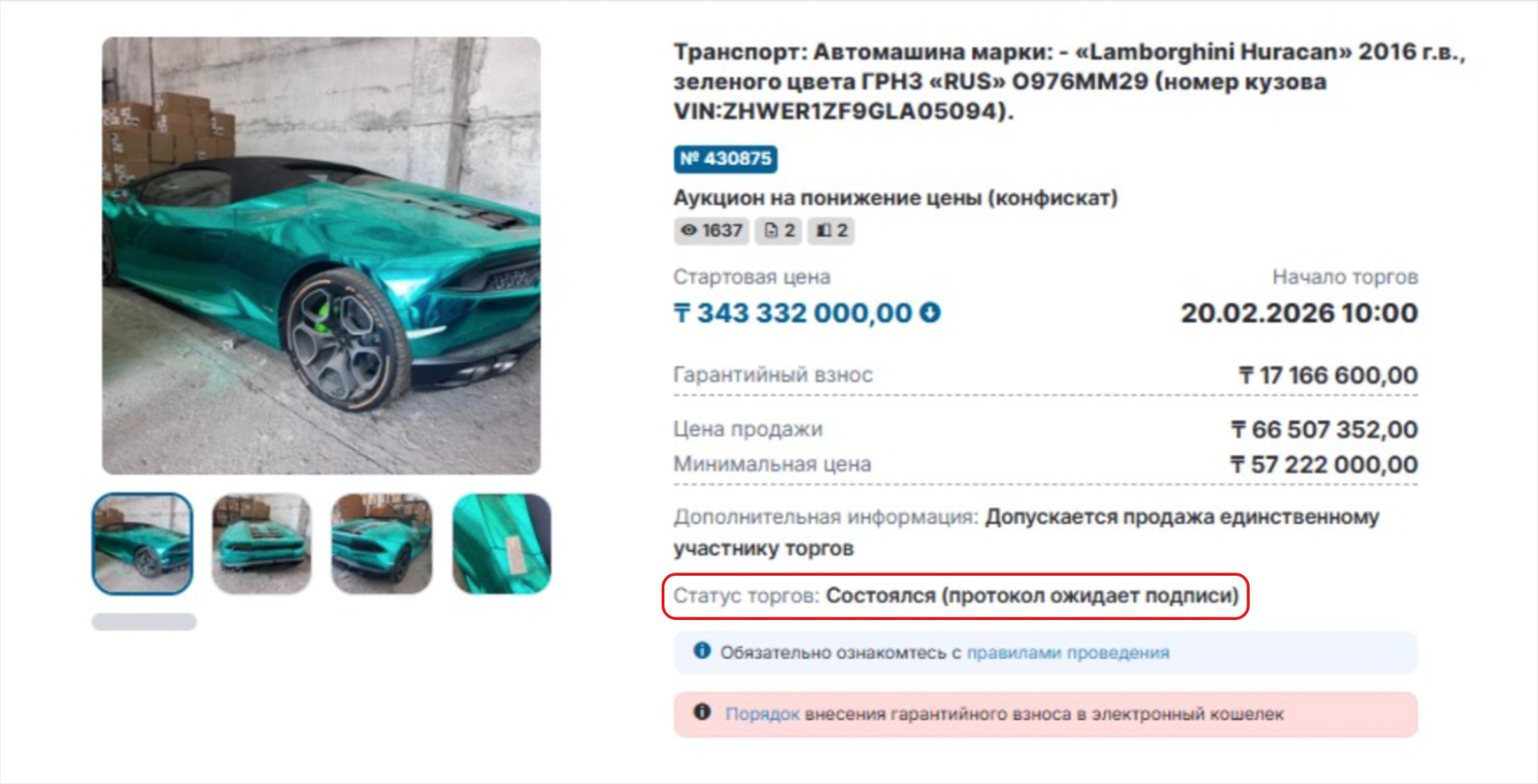 1Win онлайн-казиносын ұйымдастырушылардан тәркіленген жасыл түсті Lamborghini Huracan көлігі мемлекеттік аукционда сатылды, - деп хабарлайды Tengrinews.kz тілшісі.