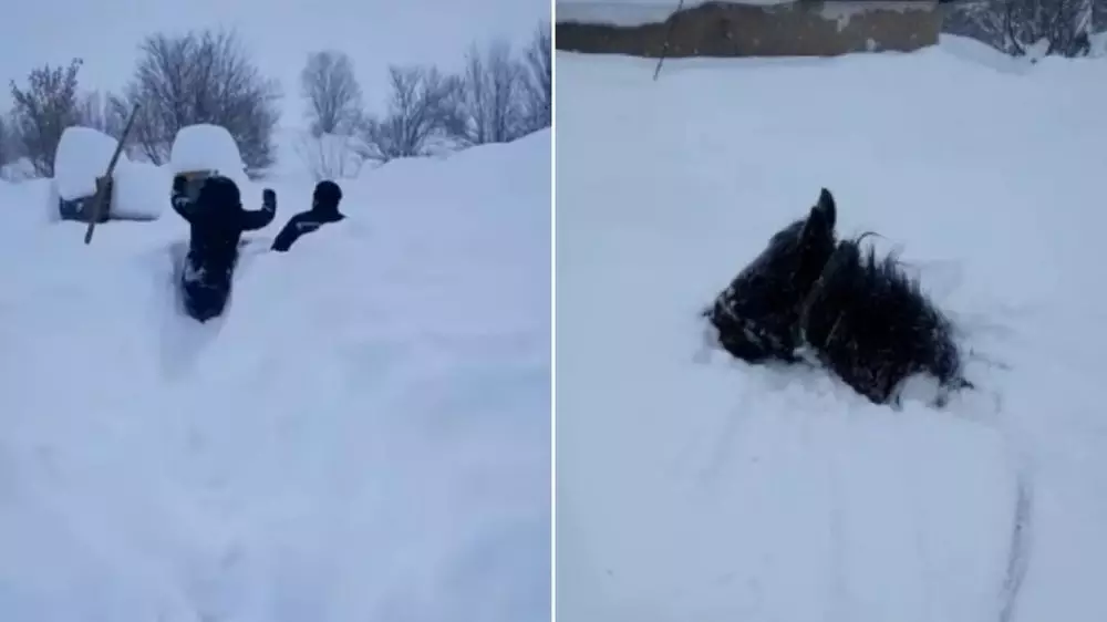 Әлеуметтік желілерде де Үржар ауданынан видео тарады, онда жылқы қарда тұрып қалғаны көрінеді.