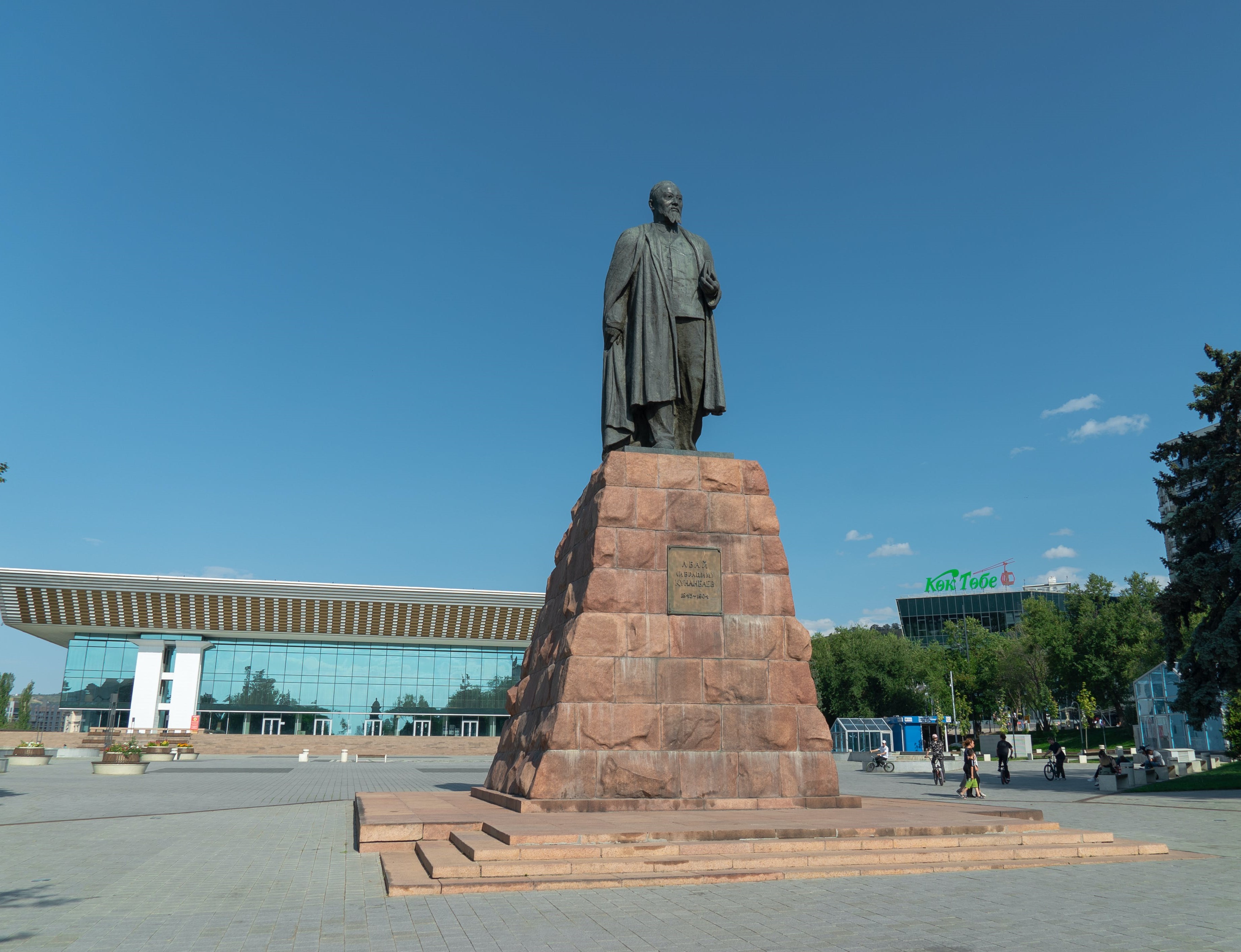 Ескерткіштің артқы жағында концерттер мен басқа да қалалық іс-шаралар жиі өтетін кең алаң және Республика сарайы орналасқан. "Арман" кинотеатры мен Көктөбеге көтерілетін аспалы жол да сол жерде орналасқан. Төменірек "Қазақстан" қонақүйі мен фонтан тұр. Осы жерден Тереңқұр соқпағының серуендеу аймағы басталады немесе Шоқан Уәлиханов атындағы скверге жаяу баруға болады.