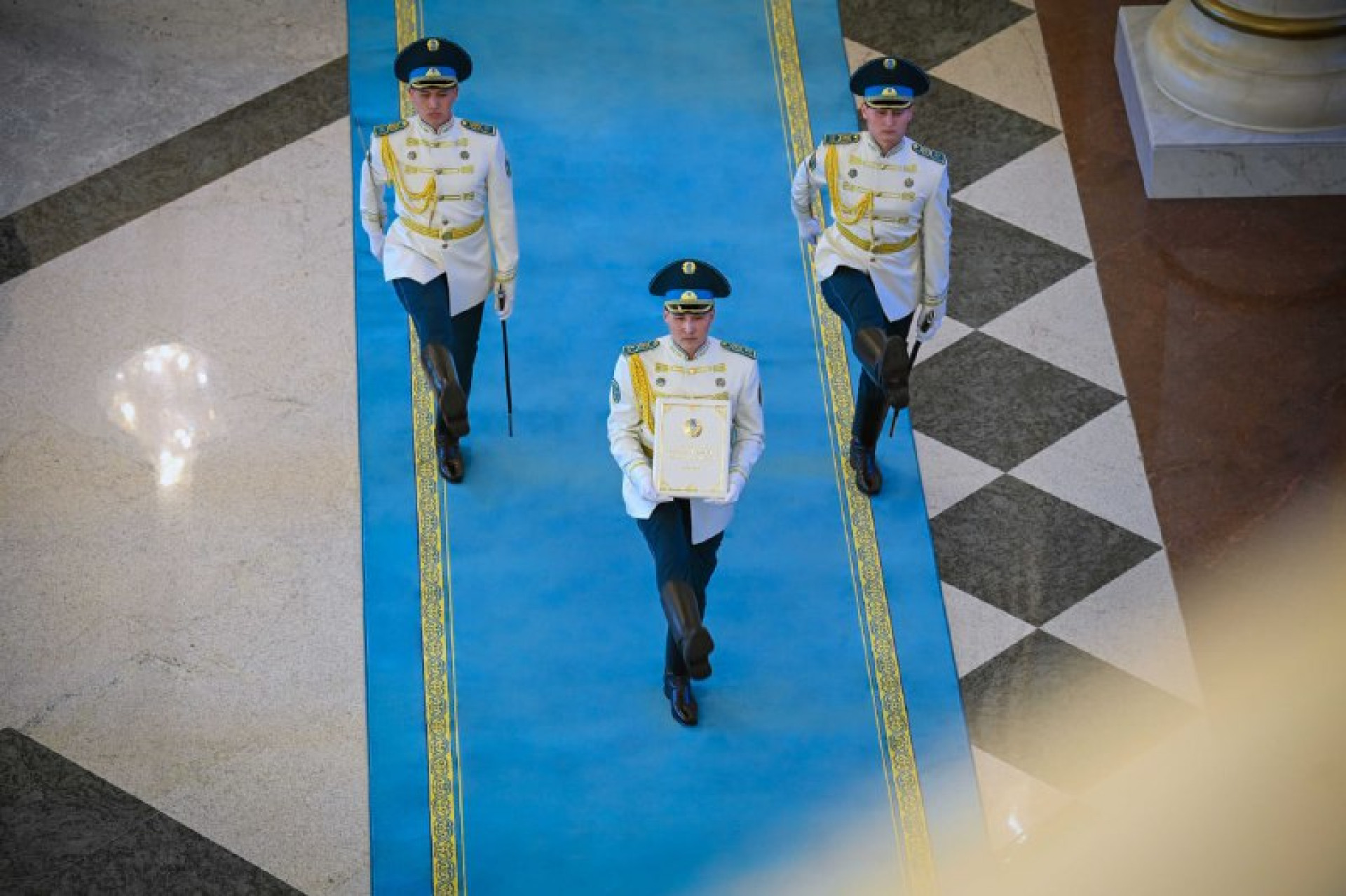 Құрмет қарауылы Қазақстан Республикасының жаңа Конституциясын салтанатты түрде ортаға алып шыққан соң еліміздің Әнұраны орындалды.