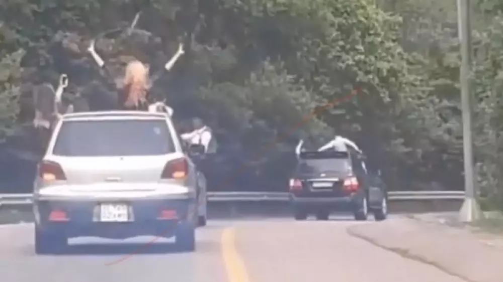 Кадрларда автокөліктердің жүріп жатқанына қарамастан терезеден беліне дейін шыққан қыздар мен жігіттер көрінеді.