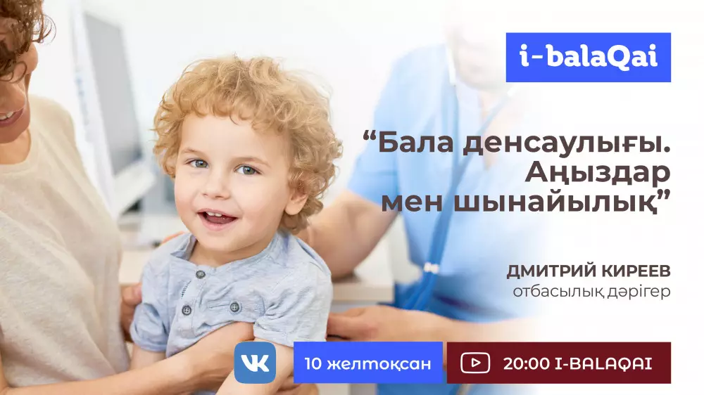 Бүгін, 10 желтоқсанда сағат 20:00-де I-BALAQAI YouTube-каналынан көріңіздер. Эфир қонағы "Бала денсаулығы. Аңыздар мен шынайылық" атты тақырыпта сөз қозғайды және баланың иммунитетін қалай көтеруге болатынын айтады.
