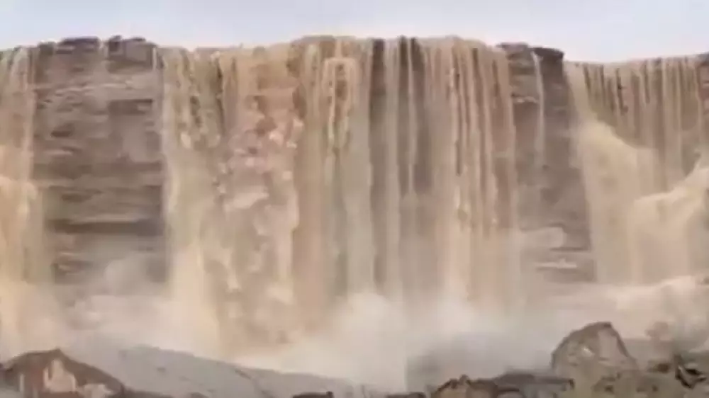 Видеода жаңбыр суы сарқырама болып ағып жатқаны көрсетілген.