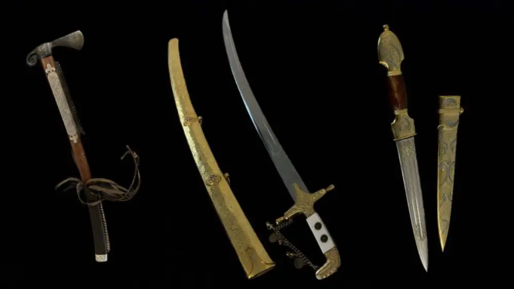 Қылыштар ерекше қызығушылық тудырады, бірінің бағасы 930 мың теңгеден, енді бірінің бағасы 837 мың теңгеден басталады.