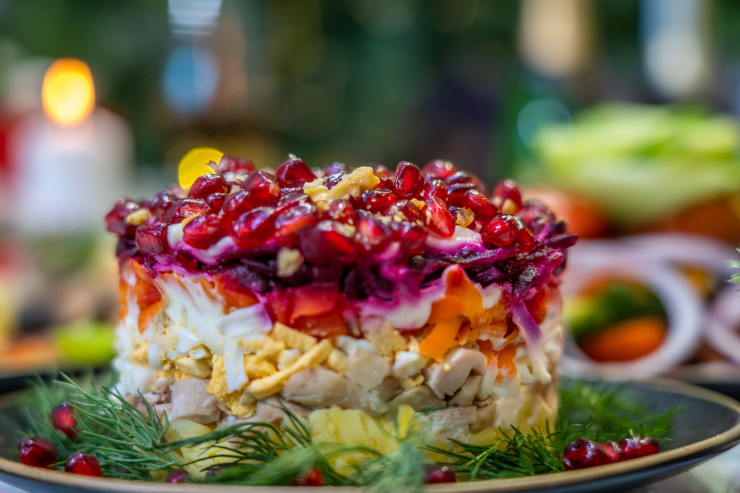 Міне, тағы бір қарапайым, керемет салат. Алғашында оны "Жаңа жыл" деп атағымыз келді, өйткені ол түрлі-түсті, қысқы мейрамға дәл келеді. Бірақ онда салатты жылына бір рет қана дайындау керек болады. Біз оны кез келген уақытта өзекті болады деп ойладық және "Мереке" деп атадық. Дайындау үшін тауық еті, жұмыртқа, сәбіз, қызылша, грек жаңғағы, майонез, сарымсақ және анар аламыз. Тауық, жұмыртқа, сәбіз және қызылша қайнатылып, майдалап туралған болуы керек. Майонезге біраз сарымсақ қосыңыз. Бәрін тағы да қабаттап салып, үстіне жаңғақтар мен піскен анар дәндерін себіңіз. Қараңызшы - қандай сұлулық!