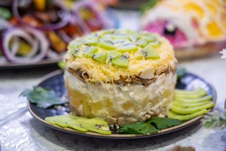 - Бізде мұндай рецепт көп. Мысалы, "Изумруд" салаты. Ол үшін қайнатылған тауық еті, аздап қуырылған қозықұйрық, консервіленген ананас, ірімшік, пісірілген жұмыртқа, майонез және киви қажет болады. Барлығы қабат-қабат салынады: тауық еті, саңырауқұлақтар, майдалап туралған ананас, ірімшік және жұмыртқа. Тұз және бұрыш - дәміне қарай. Әр қабатқа жұқалап майонез жағылуы керек, ал үстіңгі қабат киви тілімдерімен безендірілуі керек. Салат ерекше, өте әдемі және дәмді болып шығады.