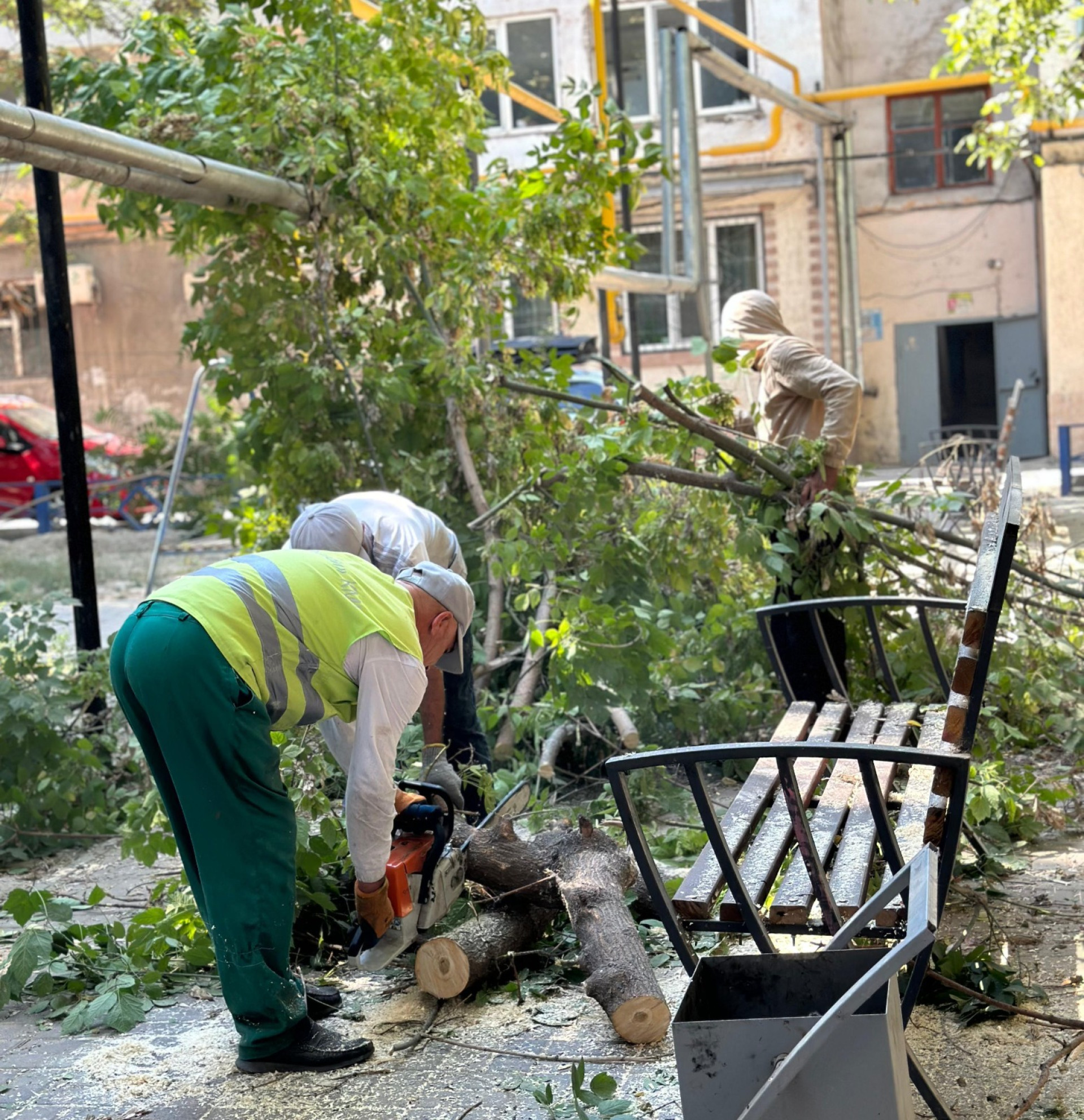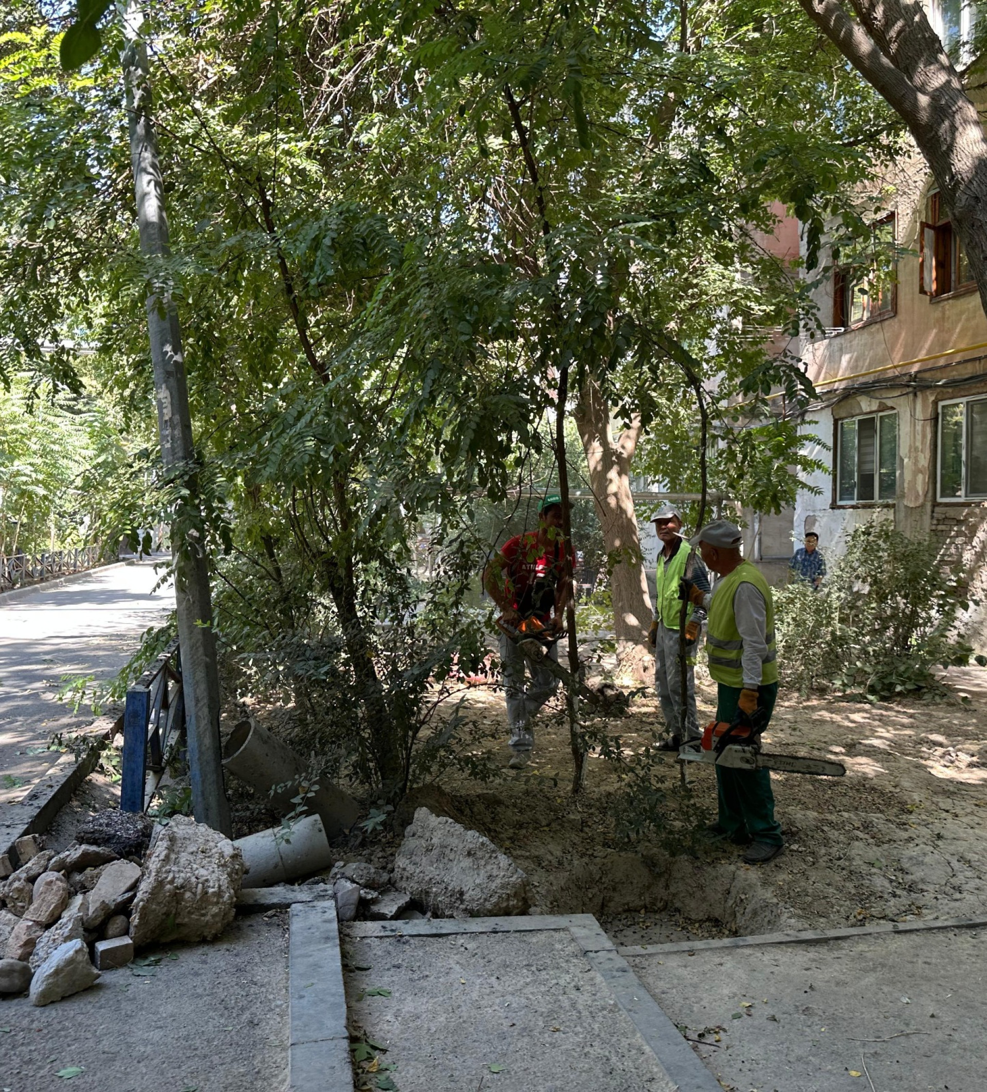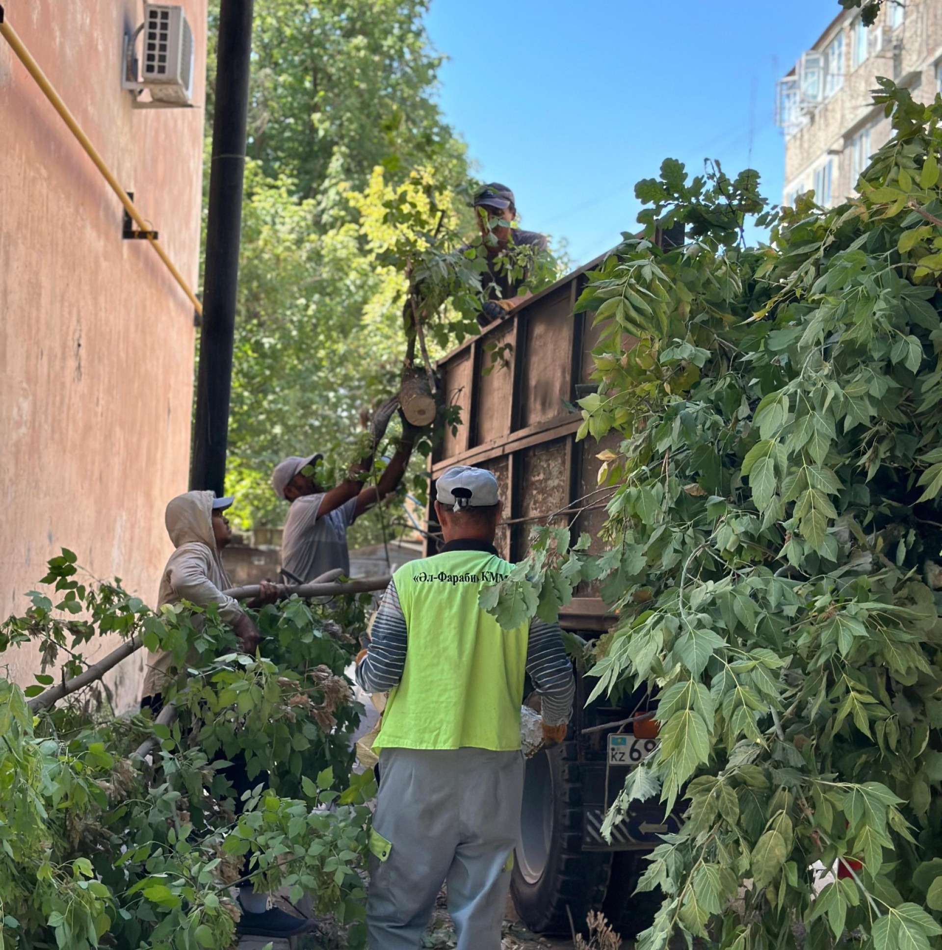 - Ағаштардың қураған бұтақтарын кесу және арнайы техникамен арту;