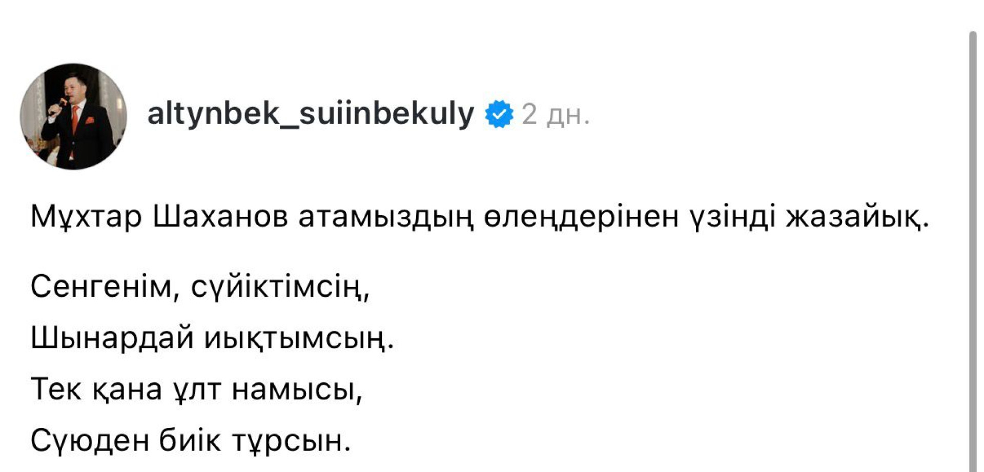 "Мен бүгін Мұхтар Шахановқа "Қазақстанның Еңбек Ері" атағын беру туралы Жарлыққа қол қойдым. Еліміздің ең жоғары марапатын ақынға Ұлт ұясы – Ұлытаудың төрінде тапсырғанды жөн көрдім", - деді Мемлекет басшысы.