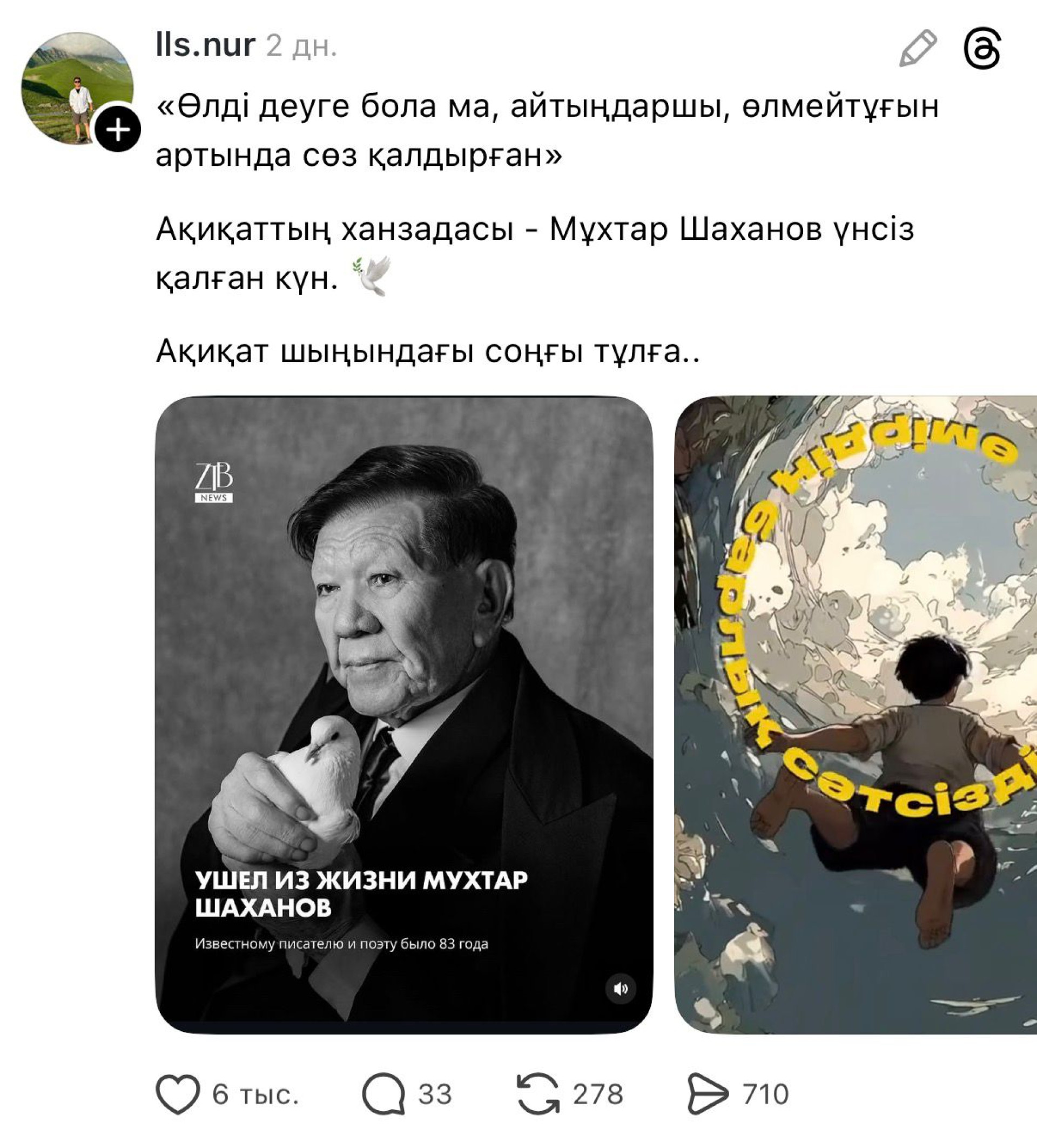 Бүгінде әлеуметтік желілерде Қазақстан халқы біртуар ақын Мұхтар Шахановпен қоштасып жатыр. Олар ақынмен түскен суреттерін, естелік әңгімелерін жариялап, қазақ халқына қайғыра көңіл айтып жатыр. Ал пікір қалдырып жатқандардың санында есеп жоқ. Осыдан-ақ Мұхтар Шаханов артына өлмейтін із қалдырғанын аңғаруға болады. Себебі ол - ұлт намысын, руханиятын, қазақ тілі мен әдебиетін бірінші орынға қойған бірегей тұлға.
