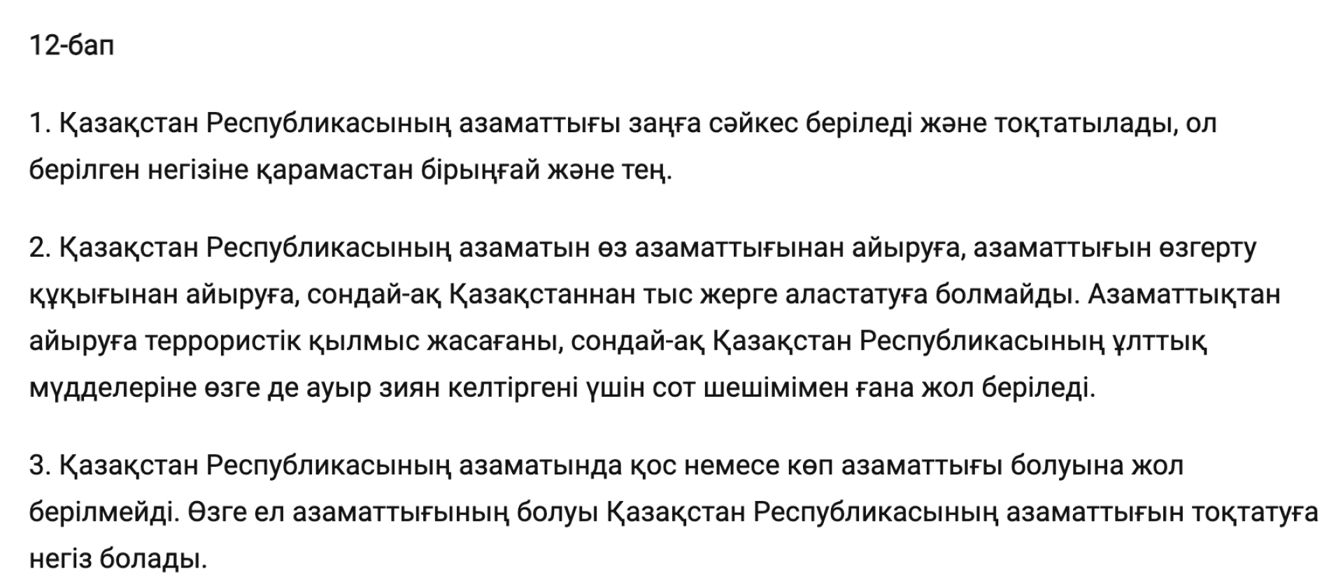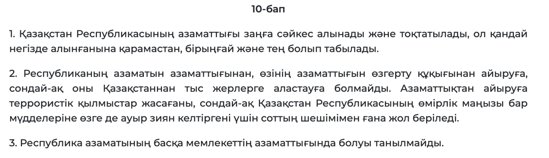 "Қазақстан Республикасының азаматы қосарланған немесе көп азаматтыққа ие бола алмайды. Өзге азаматтықтың болуы - Қазақстан Республикасының азаматтығын тоқтатуға негіз".