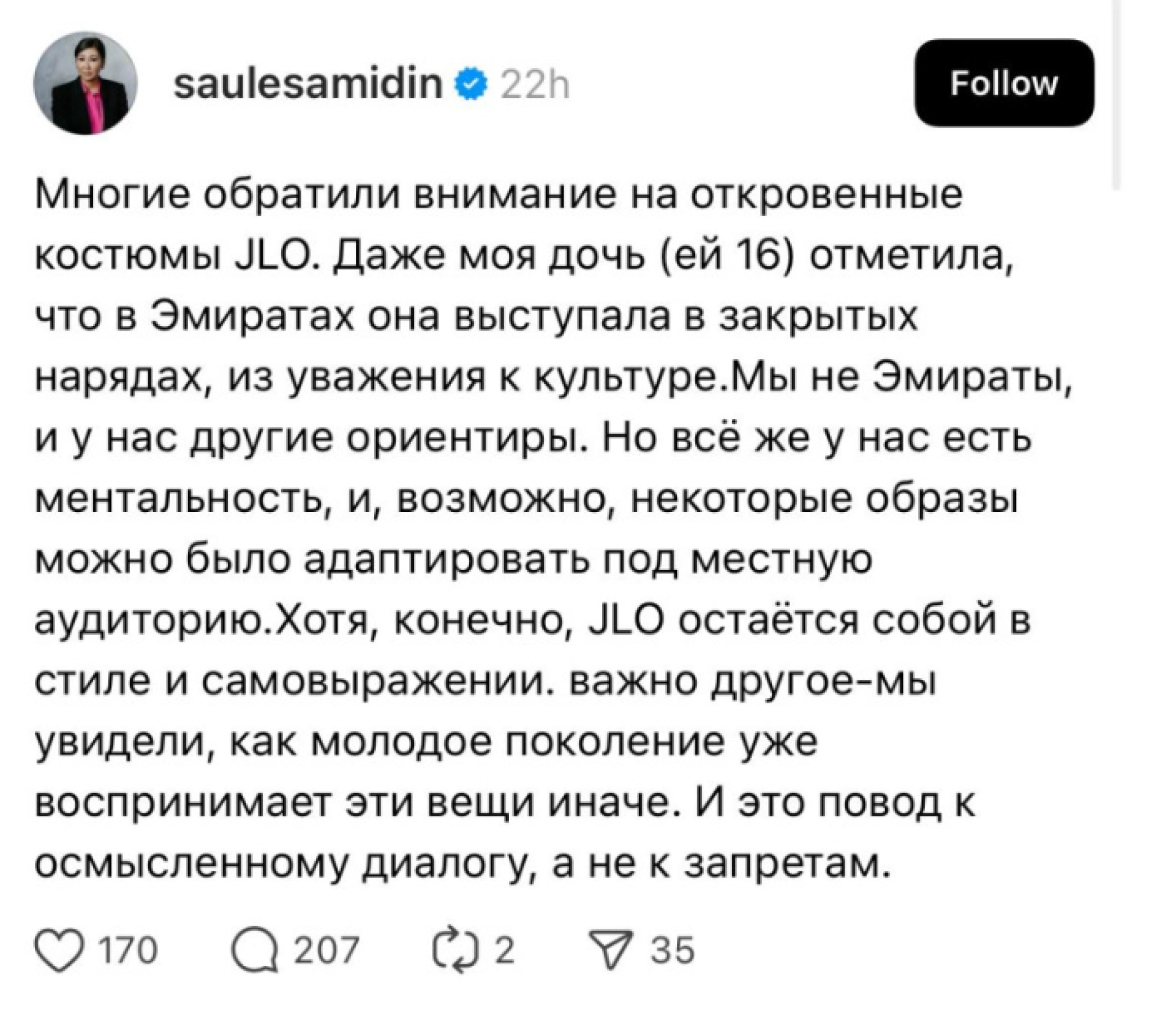 "Көпшілік J.Lo-ның ашық-шашық киімдеріне назар аударды. 16 жастағы қызымның өзі айтты: Эмираттарда ол жабық киімде өнер көрсетті, мәдениетке құрмет ретінде. Біз Эмират емеспіз, өзіміздің құндылықтарымыз бар. Бірақ, бізде де менталитет бар, кей образдарды жергілікті аудиторияға бейімдеуге болар еді. Әрине, J.Lo — өзіндік стилімен ерекшеленетін тұлға. Бірақ, жастар мұны басқаша қабылдайтынын байқадық. Бұл — тыйым салуға емес, саналы диалогқа себеп", – деп жазды депутат.