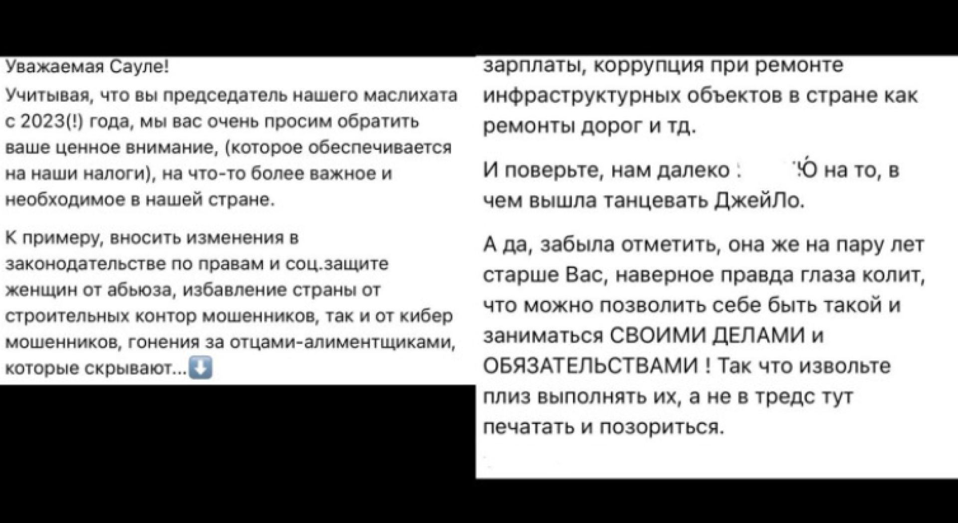 "Құрметті Сауле! 2023 жылдан бері мәслихат төрағасы ретінде сізден маңызды мәселелерге назар аударуыңызды сұраймыз: әйелдердің құқықтары мен әлеуметтік қорғанысы, құрылыс алаяқтары мен киберқылмыскерлерге қарсы шаралар, алимент төлемейтін әкелер, инфрақұрылымдағы жемқорлық – жол жөндеу, мектеп, балабақша тапшылығы… Ал J.Lo не киіп шыққаны бізге маңызды емес", – деді бір қолданушы.