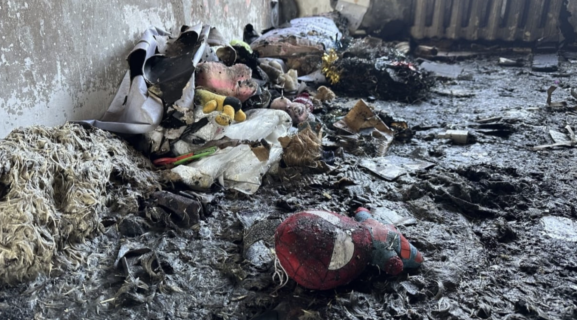 Өрт шыққан пәтер қазір толық қираған: жиһаздар күйген, қабырғалар бүлінген, жерде ойыншықтар мен суреттер шашылып жатыр.